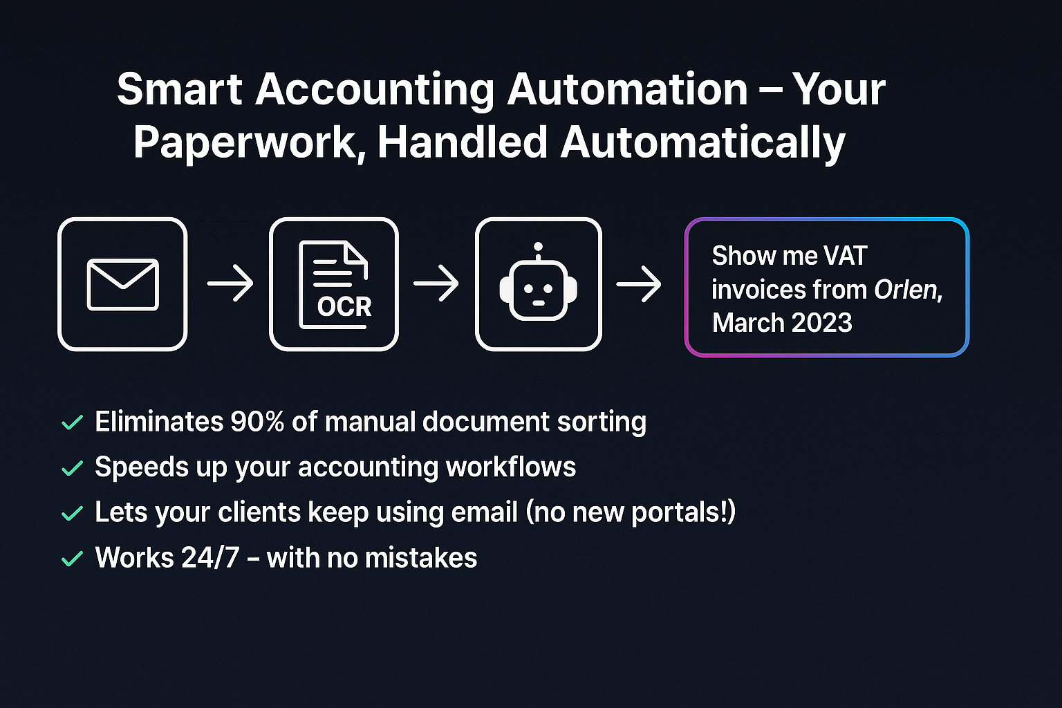 (e.g. “Show me VAT invoices from Orlen, March 2023”)